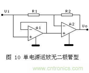 圖10是利用單電源運(yùn)放的跟隨器的特性設(shè)計(jì)的,單電源的跟隨器,當(dāng)輸入信號(hào)大于0時(shí),輸出為跟隨器;當(dāng)輸入信號(hào)小于0的時(shí)候,輸出為0.使用時(shí)要小心單電源運(yùn)放在信號(hào)很小時(shí)的非線性.而且,單電源跟隨器在負(fù)信號(hào)輸入時(shí)也有非線性。