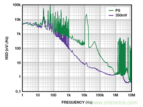 當(dāng)裕量為 350 mV 時(shí),LDO 采用壓差工作模式。此時(shí),LDO 再也不能調(diào)節(jié)輸出電壓,充當(dāng)一個(gè)電阻,輸出噪聲升至近 76 μVrms,如圖 9 所示。只有 FET 的 RDSON和輸出端的電容形成的極點(diǎn)衰減輸入噪聲。