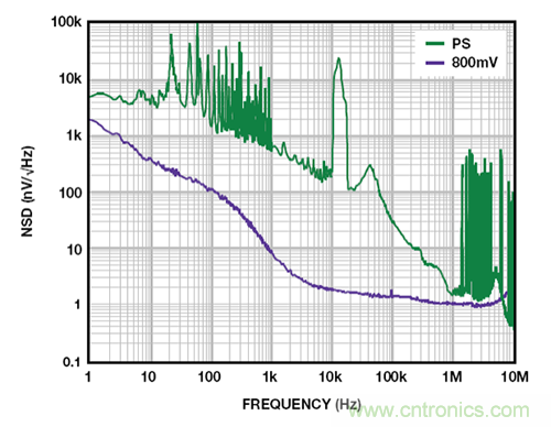 如 ADM7150 超低噪聲、高 PSRR 調(diào)節(jié)器一類的新型 LDO 實(shí)際上級(jí)聯(lián)了兩個(gè) LDO,因此,結(jié)果得到的 PSRR 約為各個(gè)級(jí)之和。這些 LDO 要求略高的裕量電壓,但能夠在 1 MHz 條件下實(shí)現(xiàn)超過 60 dB 的 PSRR,較低頻率下,PSRR 可以遠(yuǎn)超 100 dB。圖 7 所示為一個(gè) 5 V 的 ADM7150 的噪聲頻譜密度,其負(fù)載電流為 500 mA,裕量為 800 mV。10 Hz 至 100 kHz 范圍內(nèi),輸出噪聲為 2.2 μV rms。隨著裕量降至 600 mV,整流諧波開始顯現(xiàn),但當(dāng)輸出噪聲升至 2.3 μV rms 時(shí),其對(duì)噪聲的影響很小。