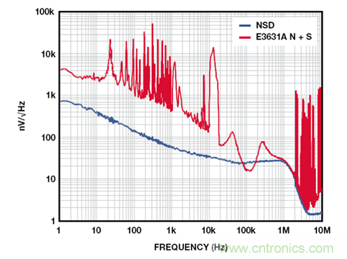 圖 4 展示的是 2.5 V ADM7160 在 500 mV 裕量和 100 mA 負(fù)載條件下,相對(duì)于 E3631A 臺(tái)式電源的輸出噪聲,該臺(tái)式電源在 20 Hz至 20 MHz 范圍內(nèi)的額定噪聲低于 350 μV-rms。1 kHz 以下的許多雜散為與 60 Hz 線路頻率整流相關(guān)的諧波。10 kHz 以上的寬雜散來自產(chǎn)生最終輸出電壓的 DC-DC 轉(zhuǎn)換器。1 MHz 以上的雜散源于環(huán)境中與電源噪聲不相關(guān)的 RF 源。在 10 Hz 至 100 kHz范圍內(nèi),這些測(cè)試所用電源的實(shí)測(cè)噪聲為 56 μV rms,含雜散為104 μV。LDO 抑制電源上的所有噪聲,輸出噪聲約為 9 μV-rms。