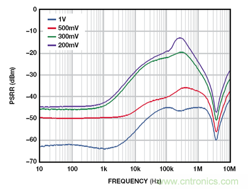 LDO 電源抑制比(PSRR)與裕量電壓相關(guān)——裕量電壓指輸入與輸出電壓之差。對(duì)于固定裕量電壓,PSRR 隨著負(fù)載電流的提高而降低,大負(fù)載電流和小裕量電壓條件下尤其如此。圖 1 所示為 ADM7160 超低噪聲、2.5 V 線性調(diào)節(jié)器在 200 mA 負(fù)載電流和 200 mV、300 mV、500 mV 和 1 V 裕量電壓條件下的 PSRR。