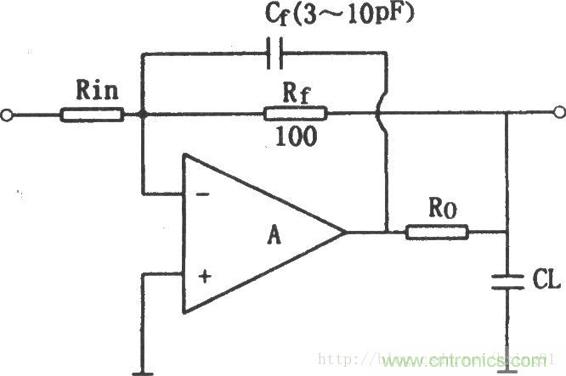 對(duì)于許多集成運(yùn)算放大電路,若輸出負(fù)載電容CL的值比100pF大很多,由于輸出電容(包括寄生電容)與輸出電阻將造成附加相移,這個(gè)附加相移的累加就可能產(chǎn)生寄生振蕩,使放大器工作嚴(yán)重不穩(wěn)定。解決這一問(wèn)題的方法是在運(yùn)放的輸出端串聯(lián)一個(gè)電阻Ro,使負(fù)載電容CL與放大電路相隔離,如圖所示,在Ro的后面接反饋電阻Rf,這樣可以補(bǔ)償直流衰減,加反饋電容Cf會(huì)降低高頻閉環(huán)電壓放大倍數(shù),Cf的選取方法是:使放大電路在單位增益頻率fT時(shí)的容抗Xcf≤Rf/10,又Xf=l/(2πfTCf),一般情況下,Ro=50~200Ω,Cf約為3~10pF。