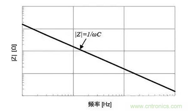 由公式(1)可看出,阻抗大小|Z|如下圖所示,與頻率呈反比趨勢(shì)p少。由于理想電容器中無(wú)損耗,故等價(jià)串聯(lián)電阻(ESR)為零。