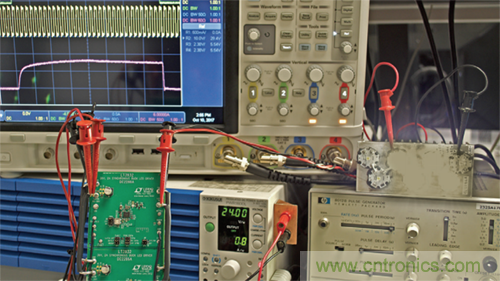 LT3932演示電路(DC2286A)設計為通過一個或兩個LED(作為降壓LED驅動器)驅動1 A的LED電流。如圖1所示,它很容易進行更改和并聯,以實現更高電流、更高電壓或并聯運行。圖4顯示了如何將兩個這樣的電路輕松連接在一起,從24 V輸入以10μs、3 A脈沖驅動4個LED。出于測試目的,脈沖發生器可用于提供同步時鐘信號,如圖4所示。在量產機器視覺系統中,可利用時鐘芯片生成同步時鐘信號和PWM脈沖。如需更高電流脈沖,可使用相同的并聯方案添加更多演示電路DC2286A轉換器。