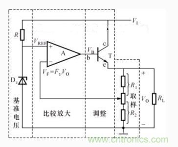 VI是整流濾波后的電壓,T為調(diào)整管,A為比較放大電路,VREF為基準(zhǔn)電壓,它由穩(wěn)壓管Dz與限流電阻R構(gòu)成。R1與R2組成反饋網(wǎng)絡(luò),是用來反映輸出電壓變化的取樣環(huán)節(jié)。