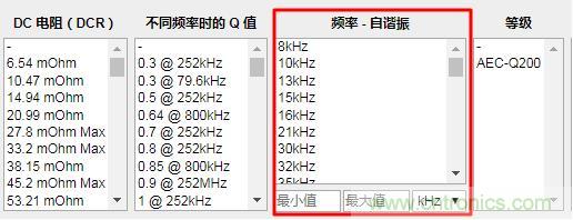 圖3:在Digi-Key 搜索器可以找到不同固定值電感的諧振頻率 (頻率-自諧振)