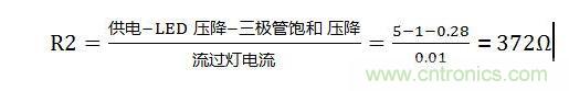 公式解析:供電5V減去三極管飽和壓降0.28V再減去LED燈發(fā)光時壓降約為1V,得出值再除以流過LED燈的電流10mA,則為所需電阻值。當然了電阻取值大點小點只會微弱影響通過LED燈電流,發(fā)光度不會有明顯變化,我們?nèi)?60的電阻。三極管飽和壓降差異不是那么大,基本在0.2~0.5V之間,0.3V居多。