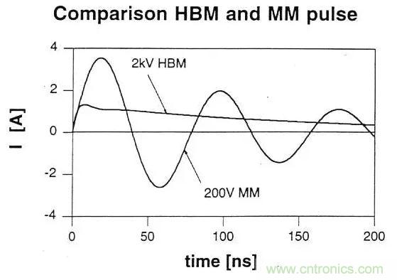 2、機器放電模式(MM):當然就是機器(如robot)移動產生的靜電觸碰芯片時由pin腳釋放,次標準為EIAJ-IC-121 method 20(或者標準EIA/JESD22-A115-A),等效機器電阻為0 (因為金屬),電容依舊為100pF。由于機器是金屬且電阻為0,所以放電時間很短,幾乎是ms或者us之間。但是更重要的問題是,由于等效電阻為0,所以電流很大,所以即使是200V的MM放電也比2kV的HBM放電的危害大。而且機器本身由于有很多導線互相會產生耦合作用,所以電流會隨時間變化而干擾變化。