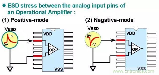 4、Analog-pin放電測試:因為模擬電路很多差分比對(Differential Pair)或者運算放大器(OP AMP)都是有兩個輸入端的,防止一個損壞導致差分比對或運算失效,所以需要單獨做ESD測試,當然就是只針對這兩個pin,其他pin全部浮接(floating)。