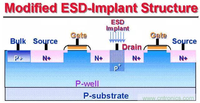 2) 接觸孔(contact)的ESD implant:在LDD器件的N+漏極的孔下面打一個P+的硼,而且深度要超過N+漏極(drain)的深度,這樣就可以讓原來Drain的擊穿電壓降低(8V-->6V),所以可以在LDD尖角發(fā)生擊穿之前先從Drain擊穿導走從而保護Drain和Gate的擊穿。所以這樣的設計能夠保持器件尺寸不變,且MOS結構沒有改變,故不需要重新提取SPICE model。當然這種智能用于non-silicide制程,否則contact你也打不進去implant。