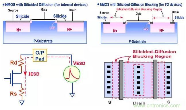 1、制程上的ESD:要么改變PN結,要么改變PN結的負載電阻,而改變PN結只能靠ESD_IMP了,而改變與PN結的負載電阻,就是用non-silicide或者串聯(lián)電阻的方法了。