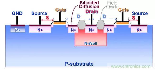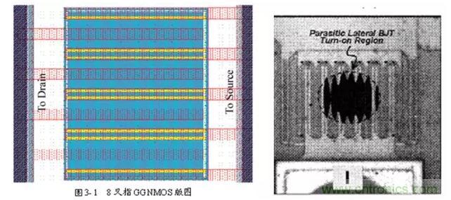 2、設計上的ESD:這就完全靠設計者的功夫了,有些公司在設計規(guī)則就已經提供給客戶solution了,客戶只要照著畫就行了,有些沒有的則只能靠客戶自己的designer了,很多設計規(guī)則都是寫著這個只是guideline/reference,不是guarantee的。一般都是把Gate/Source/Bulk短接在一起,把Drain結在I/O端承受ESD的浪涌(surge)電壓,NMOS稱之為GGNMOS (Gate-Grounded NMOS),PMOS稱之為GDPMOS (Gate-to-Drain PMOS)。
