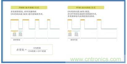 圖2:PWM(脈沖調幅)方式與PFM(脈沖調頻)方式