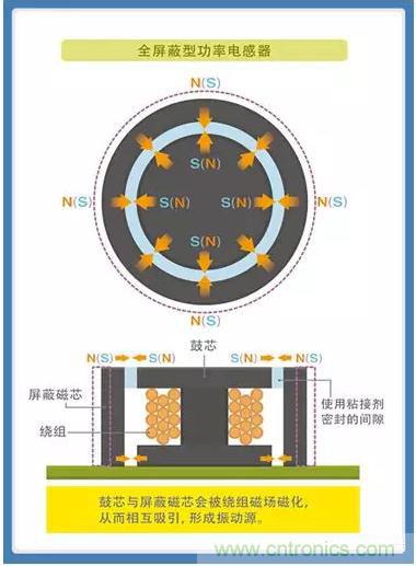 當電感器附近存在屏蔽罩等磁性體時,磁性體會因電感器漏磁通影響產生振動,從發生嘯叫。