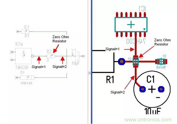 如果老板出于成本考慮,讓你設(shè)計一個單面板,也就是說你的元器件的安裝以及走線都只能在一面,你最頭疼的是有些線實在走不過去,必須跨線連接,打倆孔用跳線?如果在研發(fā)的時候還可以,但有一天你的設(shè)計變成了產(chǎn)品需要大批量生產(chǎn)了,機器折騰起跳線來要比放置一個電阻麻煩的多了,這時候0Ω的電阻就幫你大忙了,根據(jù)你的空間,你可以選用0805、0603或0402的電阻。