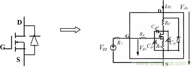 實際的功率MOSFET 可用三個結(jié)電容,三個溝道電阻,和一個內(nèi)部二極管及一個理想MOSFET 來等效。三個結(jié)電容均與結(jié)電壓的大小有關(guān),而門極的溝道電阻一般很小,漏極和源極的兩個溝道電阻之和即為MOSFET 飽和時的通態(tài)電阻。