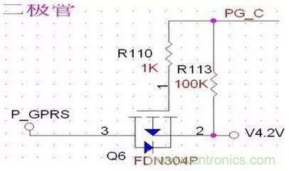 來看這個電路,控制信號PGC控制V4.2是否給P_GPRS供電。此電路中,源漏兩端沒有接反,R110與R113存在的意義在于R110控制柵極電流不至于過大,R113控制柵極的常態,將R113上拉為高,截至PMOS,同時也可以看作是對控制信號的上拉。當MCU內部管腳并沒有上拉時,即輸出為開漏時,并不能驅動PMOS關閉,此時,就需要外部電壓給予的上拉,所以電阻R113起到了兩個作用。R110可以更小,到100歐姆也可。