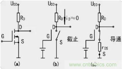 uGS>開啟電壓UT:MOS管工作在導通區,漏源電流iDS=UDD/(RD+rDS)。其中,rDS為MOS管導通時的漏源電阻。輸出電壓UDS=UDD·rDS/(RD+rDS),如果rDS《RD,則uDS≈0V,MOS管處于“接通”狀態,其等效電路如上圖(c)所示。