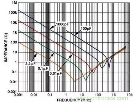 圖1:電容器的阻抗與頻率的關(guān)系。