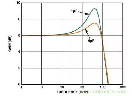 在高速電路中,很小的值就會影響電路的性能。有時候幾十個皮法(pF)的電容就足夠了。相關(guān)實(shí)例:如果在反相輸入端僅有1 pF的附加寄生電容,它在頻率域可以引起差不多2 dB的尖脈沖(見圖4)。如果寄生電容足夠大的話,它會引起電路的不穩(wěn)定和振蕩。