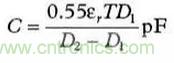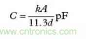 當(dāng)尋找有問題的寄生源時,可能用得著幾個計算上述那些寄生電容尺寸的基本公式。公式(1)是計算平行極板電容器(見圖5)的公式。