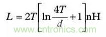 帶狀電感是另外一種需要考慮的寄生效應(yīng),它是由于印制線過長或缺乏接地平面引起的。式(2)示出了計算印制線電感(Inductance)的公式。參見圖6。
