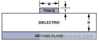 (6)H表示從接地平面到信號印制線之間的距離,W表示印制線寬度,T表示印制線厚度;全部尺寸均以密耳(mils)(10-3英寸)為單位。εr表示PCB材料的介電常數(shù)。