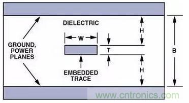 帶狀控制阻抗印制線(參見圖14)采用了兩層接地平面,信號印制線夾在其中。這種方法使用了較多的印制線,需要的PCB層數(shù)更多,對電介質(zhì)厚度變化敏感,而且成本更高——所以通常只用于要求嚴(yán)格的應(yīng)用中。