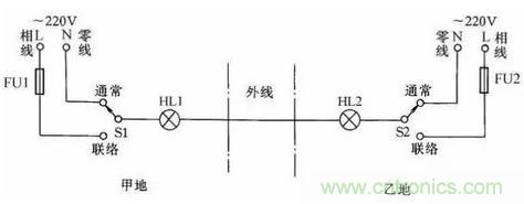 在某些生產過程中,需要兩地的生產人員能傳遞簡單的信息,以協(xié)調工作。圖22所示是用一根導線傳遞聯(lián)絡信號線路。兩地中各有一只雙擲開關控制信號燈聯(lián)絡,信號燈分別裝在兩地,一地一個。當甲地向乙地發(fā)聯(lián)絡信號時,撥動開關S1,乙地的指示燈亮,待乙地完成甲地所指示的任務后,乙地可把開關撥至“聯(lián)絡”位置,通知甲地工作已完成。