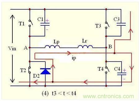 由于T4的關斷,原邊電流ip突然失去通路,但由電感的原理我們知道,原邊電流不允許突變,需要維持原來的方向,以一定的速率減少。所以,原邊電流ip會對C4充電,使C4兩端的電壓慢慢往上升,同時抽走C3兩端的電荷。