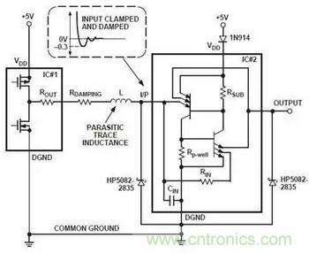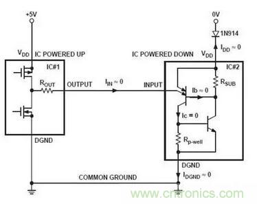 如果任何時候器件的數字輸入或輸出都超過VDD,可以在VDD串聯二極管(如下圖使用1N914)來阻止SCR觸發和隨后的閂鎖產生。這是因為二極管能夠防止寄生橫向PNP晶體管的基極電流從VDD引腳流出,從而防止SCR觸發