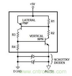 如果器件的數字輸入和輸出隨時低于DGND,那么從這些輸入或輸出連接到DGND的肖特基二極管將有效地將負偏移鉗位在-0.3V至-0.4V之間。 這可以防止寄生NPN晶體管的發射極與基極結導通,并且還可以防止SCR觸發。