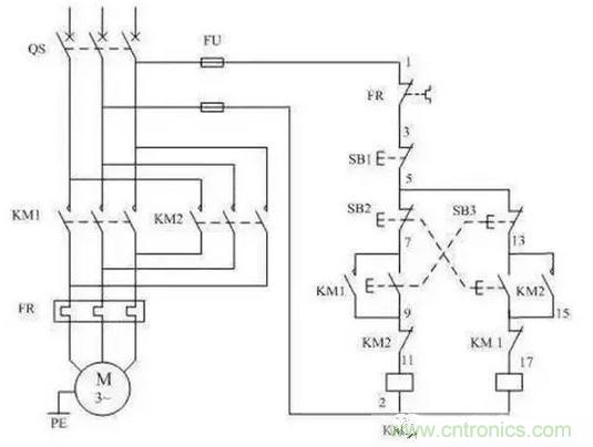 1、接觸器互鎖:KM1線圈回路串入KM2的常閉輔助觸點,KM2線圈回路串入KM1的常閉觸點。當正轉接觸器KM1線圈通電動作后,KM1的輔助常閉觸點斷開了KM2線圈回路,若使KM1得電吸合,必須先使KM2斷電釋放,其輔助常閉觸頭復位,這就防止了KM1、KM2同時吸合造成相間短路,這一線路環節稱為互鎖環節。