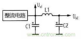 在圖 5 的電路中,整流電路輸出的單向脈動性直 流電壓先經(jīng)電容 C1 濾波,去掉大部分交流成分,然后 再加到 L1 和 C2 濾波電路中。