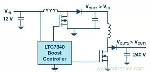 而另一個獲得較高升壓因子的方案就是使用多相 (Multi Output Phases)。以ADI公司的LTC7840芯片為例,當中包含兩個升壓控制器。這使得實現兩相升壓概念變得容易。圖三顯示了電源電壓為12V的示例,輸出升壓至240V電壓。兩相升壓級將電壓分開增加,使得每級僅需要將電壓增加約4.5倍。