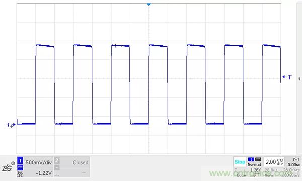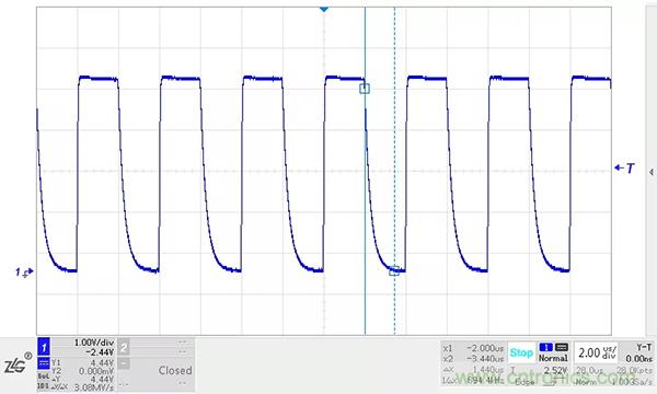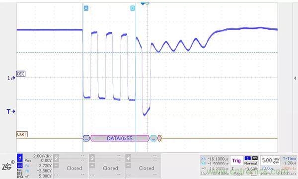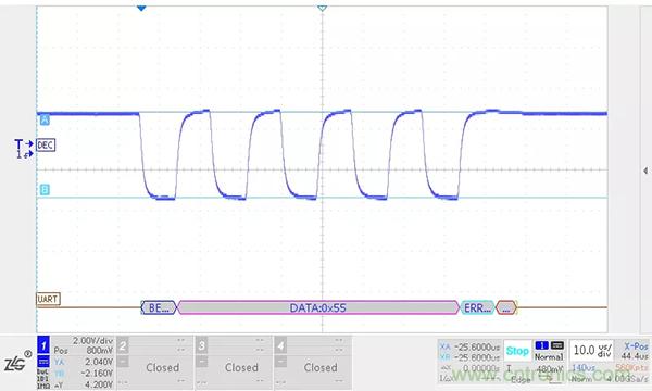 在顯性狀態期間,總線的寄生電容會被充電,而在恢復到隱性狀態時,這些電容需要放電。如果CANH、CANL之間沒有放置任何阻性負載,電容只能通過收發器內部的差分電阻放電。我們在收發器的CANH、CANL之間加入一個220PF的電容進行模擬試驗,位速率為500kbit/s,波形如下圖所示。