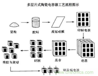 MLCC制造的工藝流程:以電子陶瓷材料作為介質,將預制好的陶瓷漿料通過流延方式制成要求厚度的陶瓷介質薄膜,然后在介質薄膜上印刷內電極,并將印有內電極的陶瓷介質膜片交替疊合熱壓,形成多個電容器并聯,并在高溫下一次燒結成一個不可分割的整體芯片,然后再芯片的端部涂覆外電極漿料,使之與內電極形成良好的電氣連接,形成MLCC的兩極。