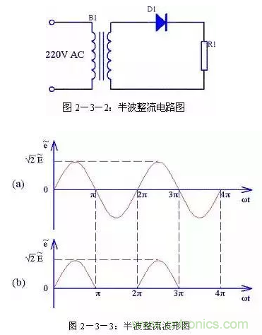 半波整流電路見圖2-3-2。其中B1是電源變壓器,D1是整流二極管,R1是負載。B1次級是一個方向和大小隨時間變化的正弦波電壓,波形如圖 2-3-3(a)所示。0~π期間是這個電壓的正半周,這時B1次級上端為正下端為負,二極管D1正向?qū)ǎ娫措妷杭拥截撦dR1上,負載R1中有電流通過;π~2π期間是這個電壓的負半周,這時B1次級上端為負下端為正,二極管D1反向截止,沒有電壓加到負載R1上,負載R1中沒有電流通過。在 2π~3π、3π~4π等后續(xù)周期中重復(fù)上述過程,這樣電源負半周的波形被“削”掉,得到一個單一方向的電壓,波形如圖2-3-3(b)所示。由于這樣得到的電壓波形大小還是隨時間變化,我們稱其為脈動直流。