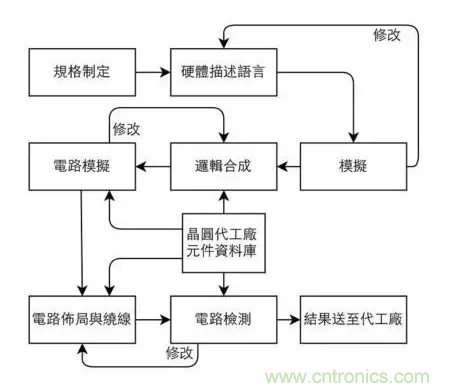 設計完規格后,接著就是設計芯片的細節了。這個步驟就像初步記下建筑的規畫,將整體輪廓描繪出來,方便后續制圖。在 IC 芯片中,便是使用硬體描述語言(HDL)將電路描寫出來。常使用的 HDL 有 Verilog、VHDL 等,藉由程式碼便可輕易地將一顆 IC 地功能表達出來。接著就是檢查程式功能的正確性并持續修改,直到它滿足期望的功能為止。
