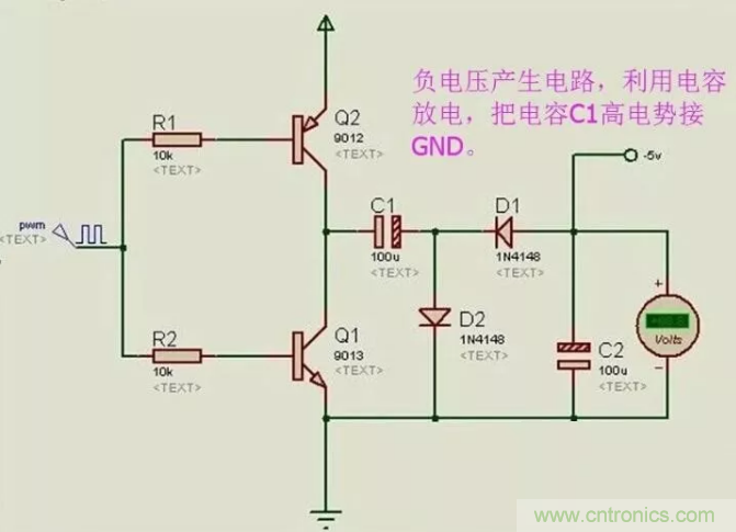 一個負電壓產生電路:利用電容充電等效出一個新電源,電容串聯在GND后,等效為電源2。則產生負電壓。