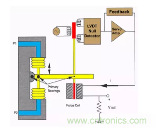 如果對這個組件施加加速度,就會對質(zhì)量施加一個力,它將試圖從零位置移動。當(dāng)零檢測器檢測到運(yùn)動時,通過伺服放大器增加線圈電流以保持零位置。
