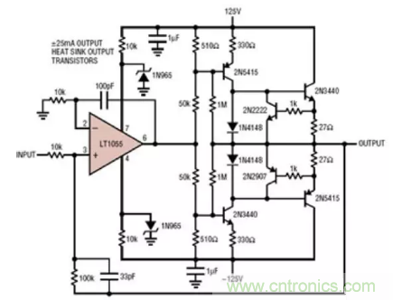 過去,像運算放大器之類線性功能的大多數IC工藝的最大電壓限制約為50V。為了構建高電壓運算放大器,設計人員在輸出端加裝了外部分立高壓晶體管,以用作升壓器。在圖1所示的的電路中,使用了Analog Devices的LT1055精密JFET運算放大器并搭配補償升壓晶體管來提供±120 V電壓。