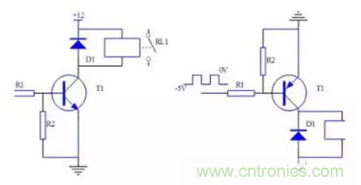 當(dāng)晶體管用來(lái)驅(qū)動(dòng)繼電器時(shí),必須將晶體管的發(fā)射極接地。具體電路如下: