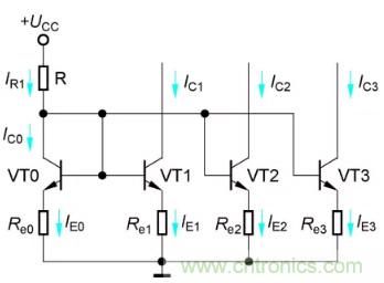 圖4所示電路是在比例恒流源基礎上得到的多路恒流源電路,IR為基準電流,IC1、IC2和IC3為三路輸出電流。由于各管的b-e間電壓UBE數值大致相等,因此可得近似關系