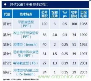 1985年前后美國(guó)GE成功試制工業(yè)樣品(可惜后來(lái)放棄)。自此以后, IGBT主要經(jīng)歷了6代技術(shù)及工藝改進(jìn)。