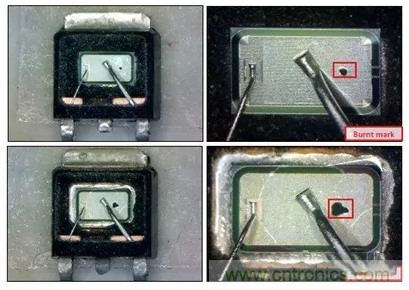 例2:日光燈電子鎮(zhèn)流器的PFC電路,系統(tǒng)在動(dòng)態(tài)老化測(cè)試過程中,MOSFET產(chǎn)生損壞失效,測(cè)試實(shí)際的電路,在起動(dòng)過程中,MOSFET實(shí)際驅(qū)動(dòng)電壓只有5V左右,MOSFET相當(dāng)于有很長的一段時(shí)間工作在線性區(qū),器件形成局部熱點(diǎn),而且離G極比較近,因此,器件是在開通過程中,由于較長時(shí)間工作線性區(qū)產(chǎn)生的失效,工作波形和失效形態(tài)如圖2、圖3所示。