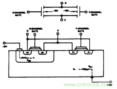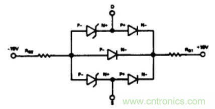 圖1是一個典型CMOS輸出開關單元的電路圖及截面圖。從不同單元和區域之間的連接關系中,我們可以畫出一個等效二極管電路圖(圖2)。如果在S端或D端的模擬輸人電壓超過電源電壓。