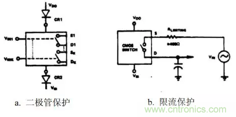 過壓能引起過大的電流和金屬化問題。通常,運算放大器的輸出作為S端或D端的電壓源,因此電流不能大于運算放大器直流輸出電流的限值。然而,瞬態感應電流仍有可能破壞CMOS器件;因此,有必要進行保護。