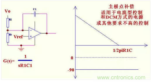 二: 單極點補償,適用于電流型控制和工作在DCM 方式并且濾波電容的ESR 零點頻率較低的電源.其主要作用原理是把控制帶寬拉低,在功率部分或加有其他補償的部分的相位達到180 度以前使其增益降到0dB. 也叫主極點補償.