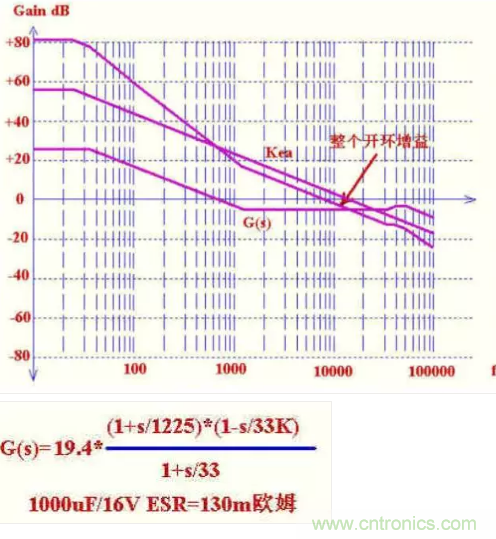 三個點的選取,第一個極點在原點,第一的零點一般取在帶寬的1/5左右,這樣在帶寬處提升相位78度左右,此零點越低,相位提升越明顯,但太低了就降低了低頻增益,使輸出調整率降低,此處我們取1.6K.第二個極點的選取一般是用來抵消ESR零點或RHZ零點引起的增益升高,保證增益裕度.我們用它來抵消ESR零點,使帶寬處保持-20db/10decade的形狀,我們取ESR零點頻率5.3K